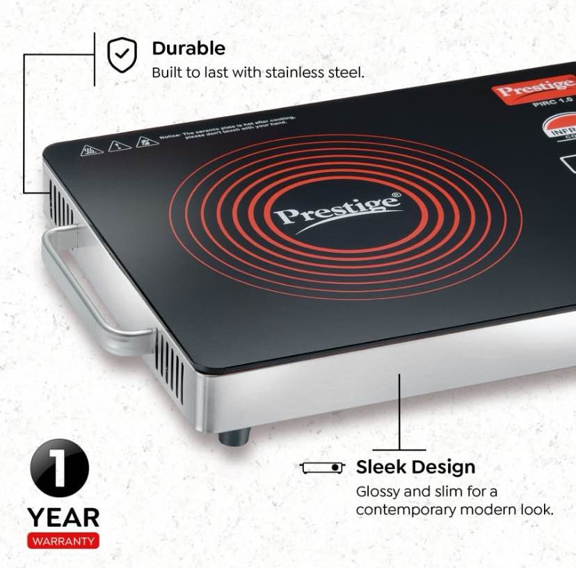 Prestige’s latest portable infrared cooktop is guaranteed to revolutionize your cooking experience. Our cooktop is compatible with any kind of flat-base cookware, including stainless steel, cast iron, glass and ceramic. And, with preset cooking modes, you can cook multiple dishes quick and easy. It’s powered by a strong 2200-watt heating element for rapid heating, so the food cooks evenly.